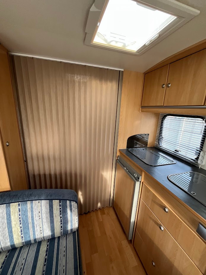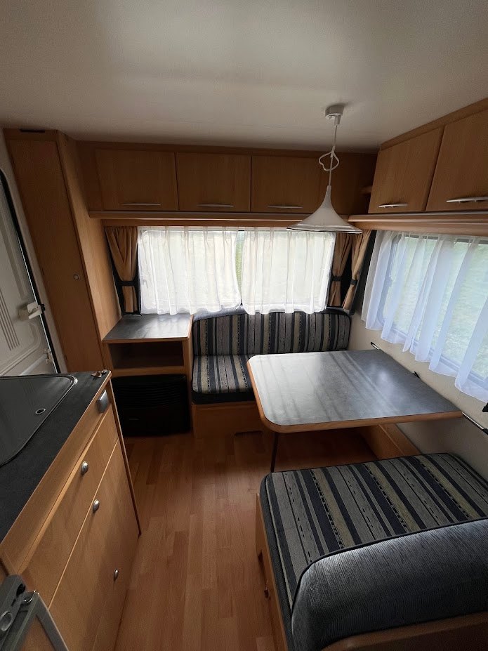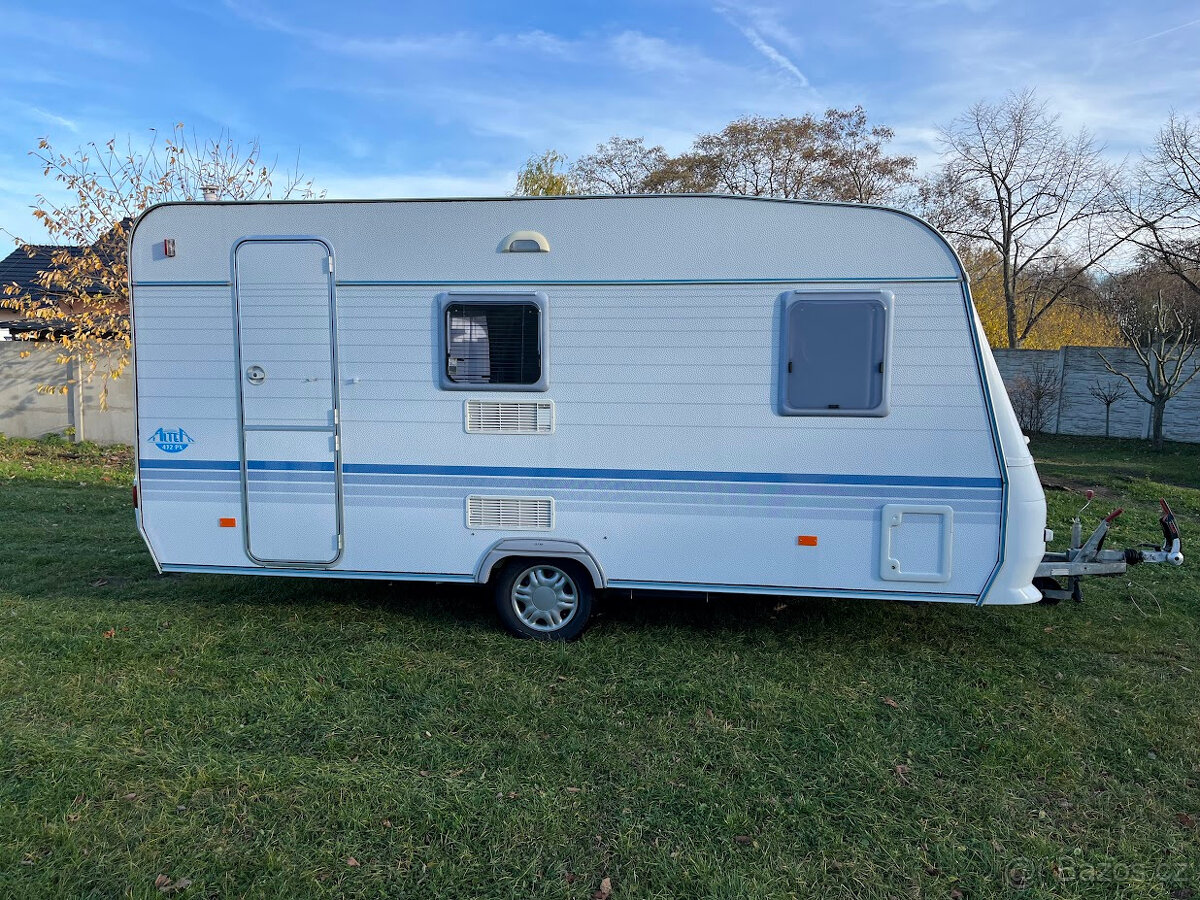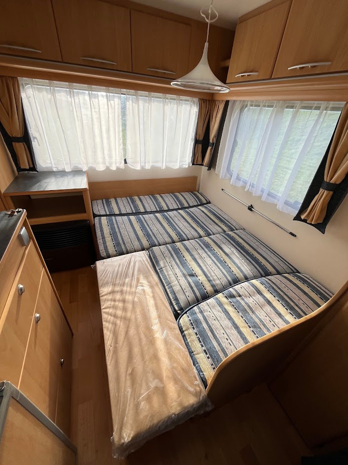 NOVINKA. Náš největší přívěs v top stavu, je určen pro 4 osoby. Délka bedny 490 cm. V přední části se nachází pevné spaní s lamelovým roštem. Na toto spaní navazuje toaletní místnost s integrovaným chemickým WC a umyvadlem s tekoucí teplou vodou. Karavan je vybaven venkovní sprchou s teplou vodou a venkovní sprchovací kabinkou. Teplá voda je podmíněna připojením k 230 V. Ve střední části je plně vybavená kuchyně s plynovým vařičem, dřezem s tekoucí teplou vodou a lednicí, která funguje na 12 V, 230 V a plyn. Při plně zapojené 13 pinové zásuvce na voze, lednice chladí i za jízdy. V zadní části je sezení se stolem, které se dá složit pro přespání 2 osob. Díky vlastní baterii, která je dobíjena solárním panelem, je možné kempovat i v místech kde není přívod elektřiny. Sluneční clona je ve výbavě. Teplotní komfort v chladnějším počasí zajistí plynové topení Trumatic. Celková hmotnost je jen 1000 Kg. Rychlost 100 Km/h. Možnost rozšíření o držák pro 2 kola na oje karavanu a nafukovacího předstanu, který významně zvětší užitný prostor - viz ceník příslušenství.
