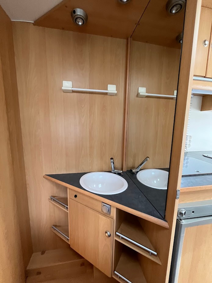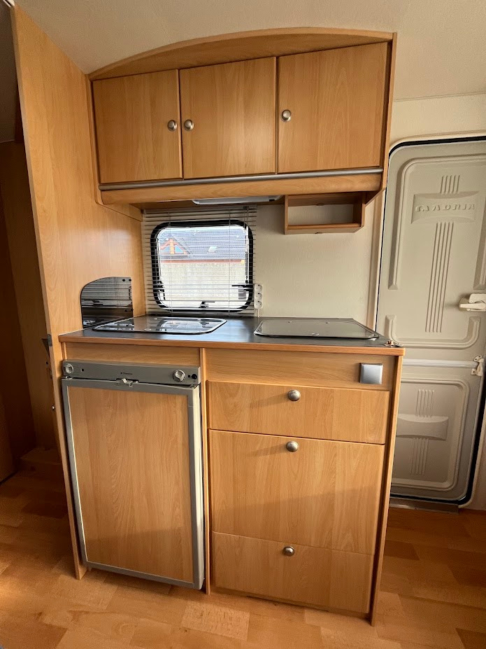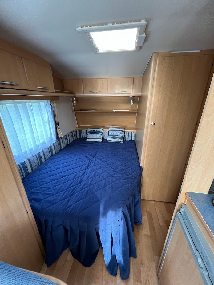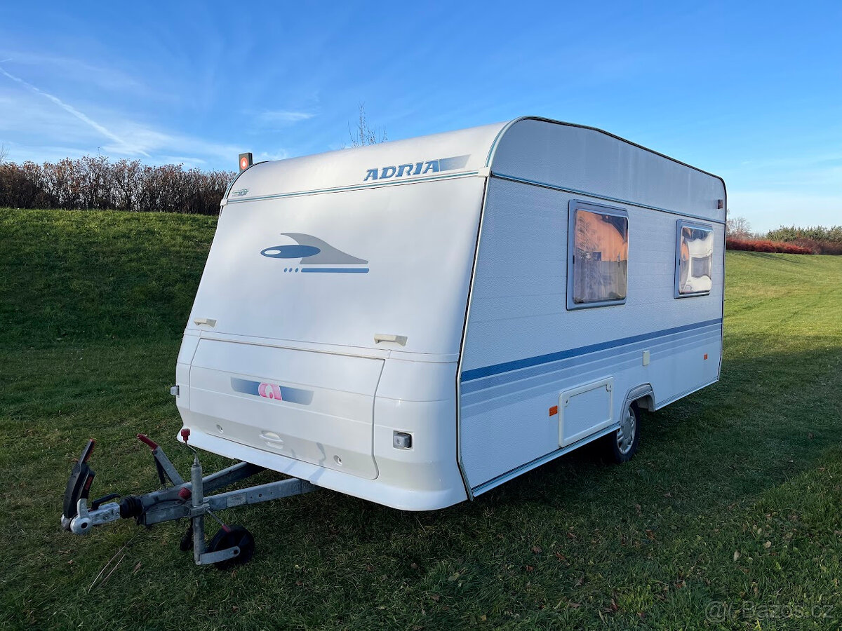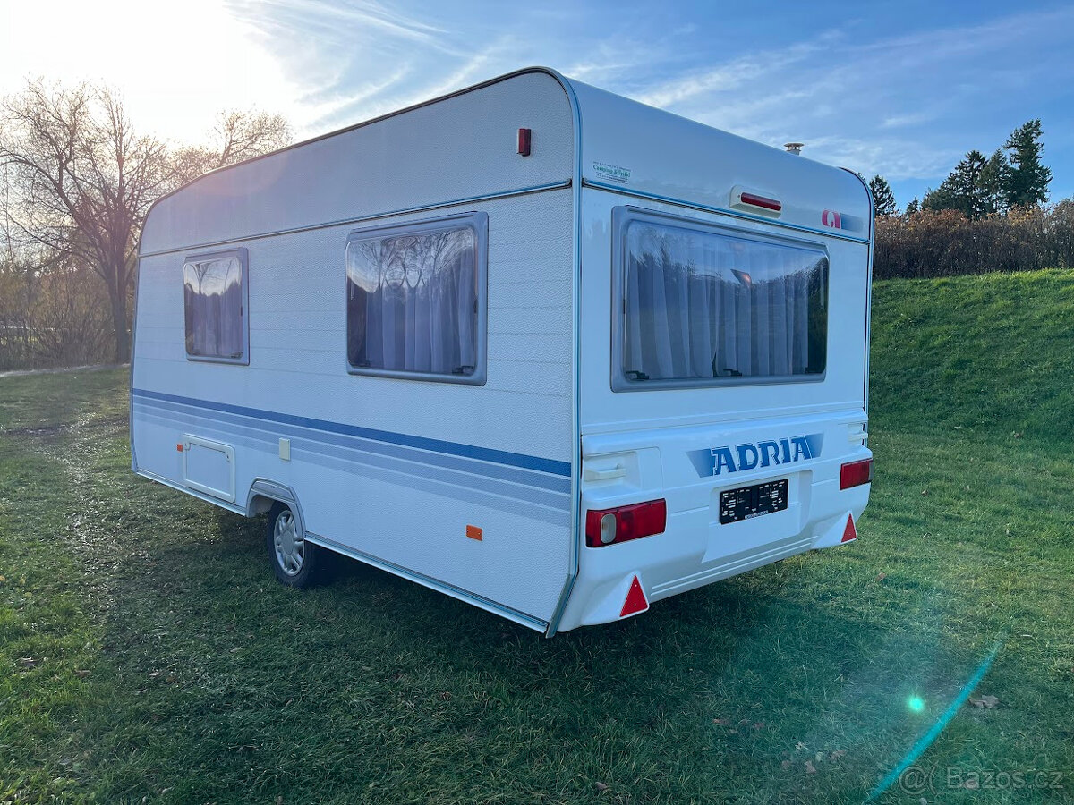 NOVINKA. Náš největší přívěs v top stavu, je určen pro 4 osoby. Délka bedny 490 cm. V přední části se nachází pevné spaní s lamelovým roštem. Na toto spaní navazuje toaletní místnost s integrovaným chemickým WC a umyvadlem s tekoucí teplou vodou. Karavan je vybaven venkovní sprchou s teplou vodou a venkovní sprchovací kabinkou. Teplá voda je podmíněna připojením k 230 V. Ve střední části je plně vybavená kuchyně s plynovým vařičem, dřezem s tekoucí teplou vodou a lednicí, která funguje na 12 V, 230 V a plyn. Při plně zapojené 13 pinové zásuvce na voze, lednice chladí i za jízdy. V zadní části je sezení se stolem, které se dá složit pro přespání 2 osob. Díky vlastní baterii, která je dobíjena solárním panelem, je možné kempovat i v místech kde není přívod elektřiny. Sluneční clona je ve výbavě. Teplotní komfort v chladnějším počasí zajistí plynové topení Trumatic. Celková hmotnost je jen 1000 Kg. Rychlost 100 Km/h. Možnost rozšíření o držák pro 2 kola na oje karavanu a nafukovacího předstanu, který významně zvětší užitný prostor - viz ceník příslušenství.